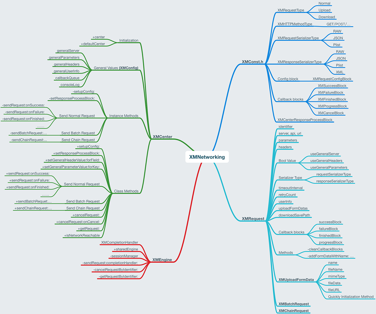 The soure code files for XMNetworking is compact and concise, there are only four core files in the library: The XMConst.h defines some const enums and blocks, and XMRequest, XMCenter, XMEngine are the declaration and implementation for core Class, the architecture of XMNetworking is as follwing: