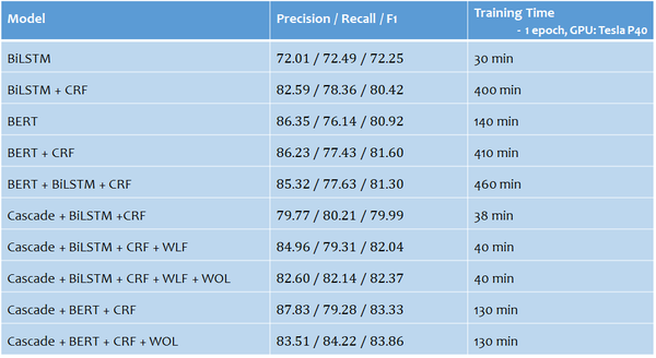 所以沿着上述思路,就在一个中文NER任务上做一些实践,写一些模型。都列在下面了,首先是 LSTM-CRF 和 BERT-CRF,然后 Cascade 开头的是几个多任务模型(因为实体类型比较多,把NER拆成两个任务,一个用来识别实体,另一个用来判断实体类型),后面的几个模型里,WLF 指的是 Word Level Feature(即在原本字级别的序列标注任务上加入词级别的表征),WOL 指的是 Weight of Loss(即在loss函数方面通过设置权重来权衡Precision与Recall,以达到提高F1的目的)