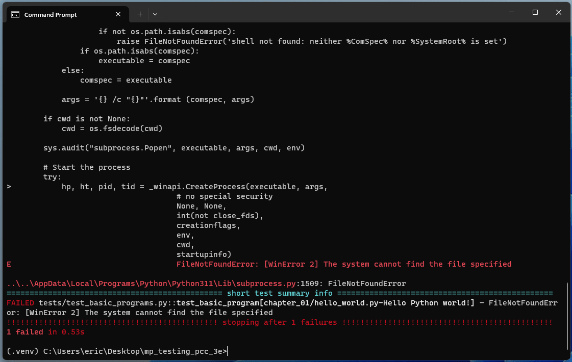 pytest -qx on Windows. The tests failed, as expected. If you’re not sure how to approach this, pasting this entire error message into GPT probably won’t fix everything, but it should point you in the right direction.Looking through the failure output closely, which I won’t reproduce here, shows that the issue is coming from the run_command() function. But the root issue is actually in the python_cmd() fixture function.